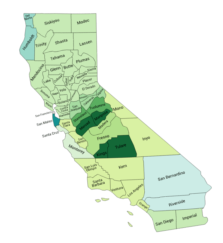 Alameda, Butte, Colusa, Contra Costa, El Dorado, Glenn, Imperial, Lake, Lassen, Marin, Mendocino, Modoc, Napa, Nevada, Placer, Plumas, Sacramento, San Diego, San Francisco, Shasta, Sierra, Siskiyou, Solano, Sonoma, Sutter, Tehama, Trinity, Yolo, Yuba |